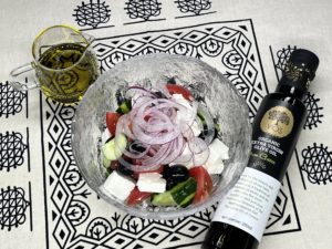 フェタチーズのグリークサラダに青々としたコロネイキをひと振りかけると、サラダが一層フレッシュに感じます。