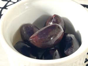 形は非常に特徴的で、楕円形で先がとがっていて一目でカラマタと分かります。