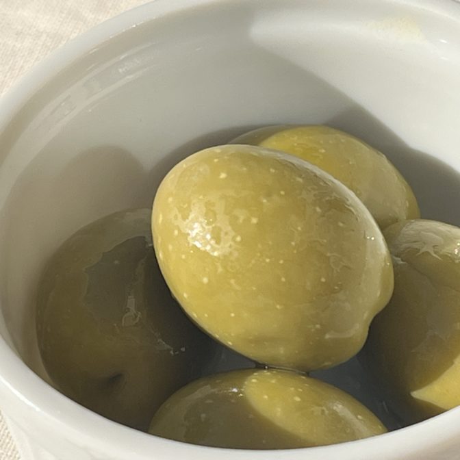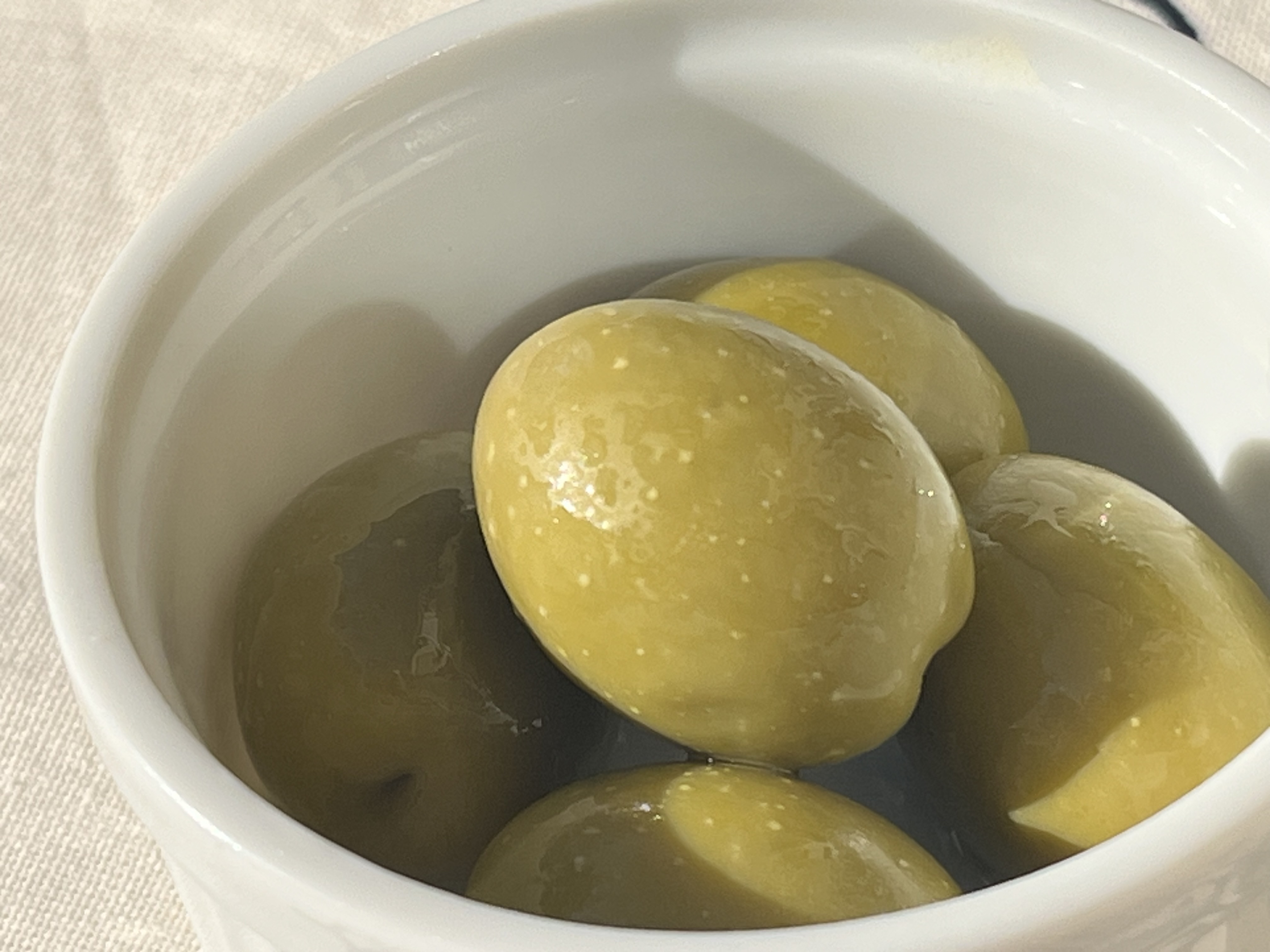 グリーン・オリーブの塩漬けは、青々としてまだ熟成していない実を早摘みします。早摘みしたオリーブはアクや渋みが強いので、塩漬けの前工程であく抜きと渋みを取り、水と海塩だけで熟成させます。